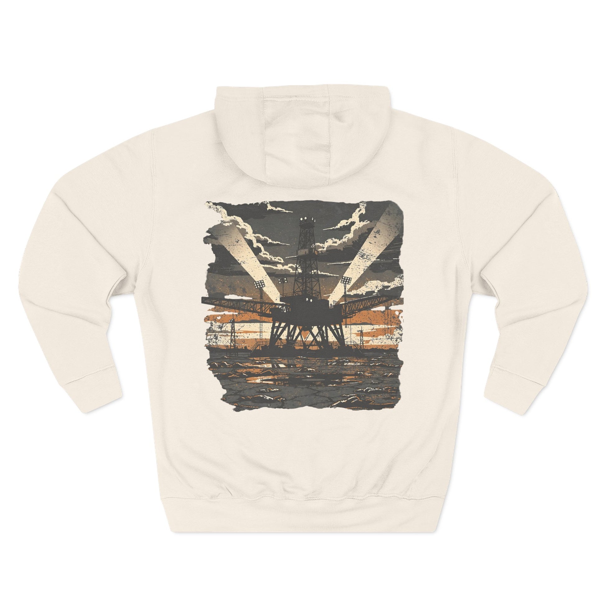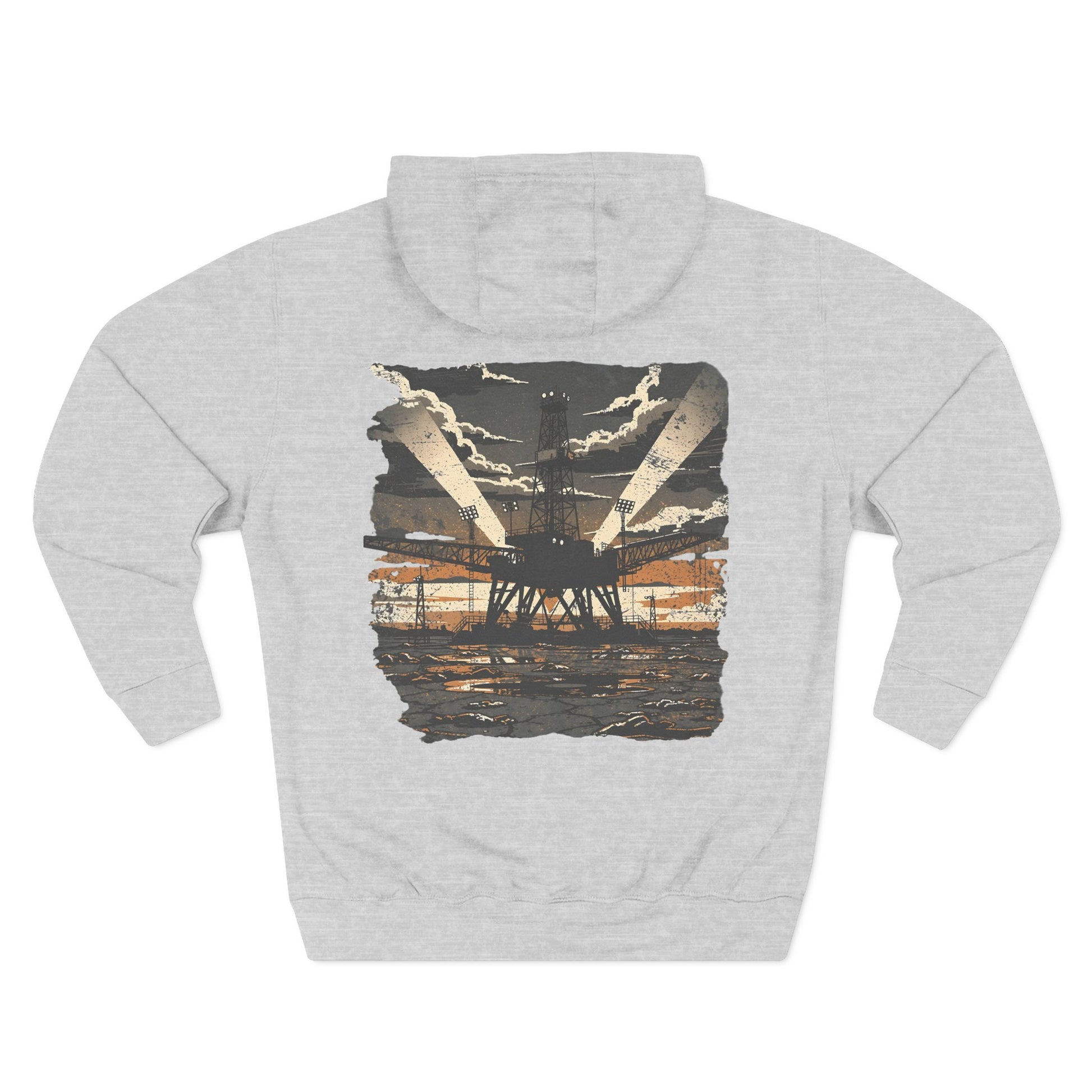 Watch the sunset over the rig with pride. This premium three-panel fleece hoodie features a stunning oilfield rig sunset design—celebrating the beauty and grit of life in the field.
